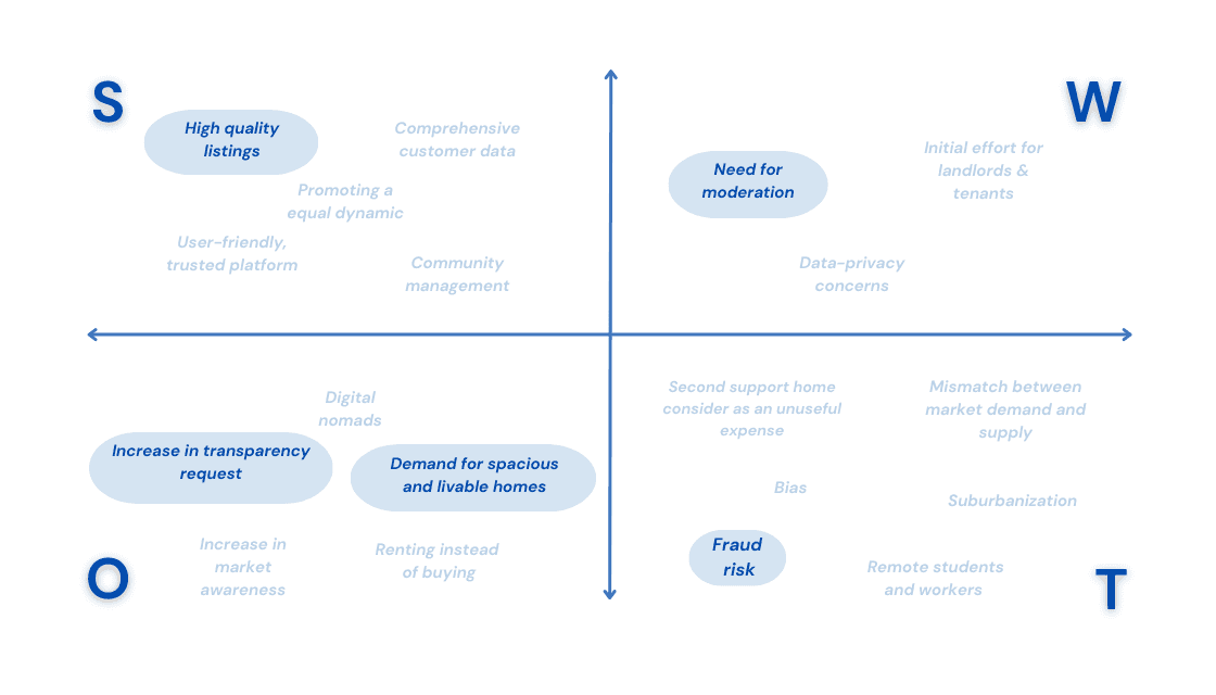 Internally, strengths include a user-centered platform, high-quality rental database, community management skills, and a reliable review platform. Leveraging these insights, the platform aims to revolutionize the rental experience with transparency, reliability, and community-driven interactions for tenants and landlords.